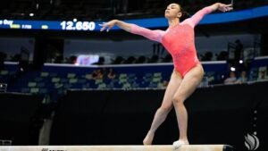 Hezly Rivera (WOGA) competes on the balance beam at the 2025 Xfinity U.S. Gymnastics Championships in New Orleans, …